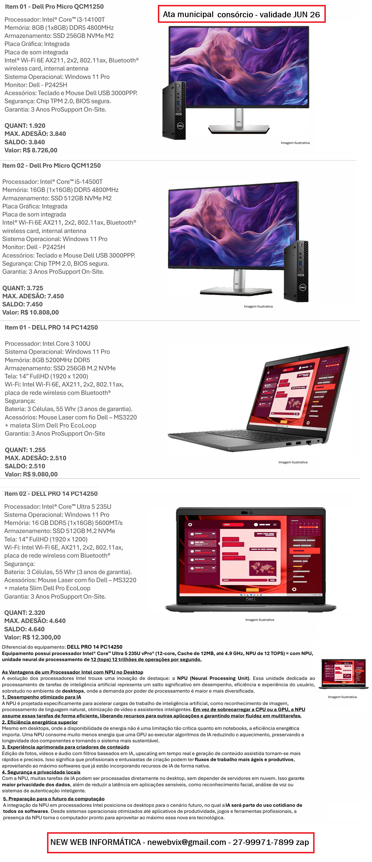 DNIT-RO: Compramos via adesão as ATAS representadas pela NEW WEB: Nobreaks de 10KVA, Aparelhos de AR SPLIT, Notebooks Samsung e também, 42 Desktops HP e pretendemos continuar comprando no futuro.